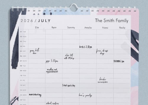 Choose between an A4 (compact, space-saving option) or A3 (larger, eye-catching display) calendar sizes. Add family tasks, to-do's, birthdays, appointments & more in each day.